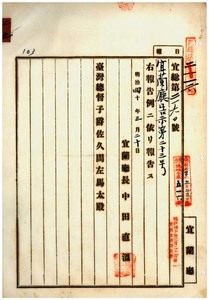 三五 第二三号 宜蘭庁管内ノ江文田・劉阿看・簡鳳源・黄氏眛・張江漢・黄呆・林良水・呉昌・林永禄ハ阿片煙膏購買吸食特許鑑札ヲ、黄保・林良水・呉昌・傴氏純・林永禄ハ阿片煙膏購買通帳亡失ニ付キ該鑑札及ヒ該通帳ヲ無効トス