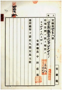 五六 第四四号 宜蘭庁利沢簡堡ノ蘇澳庄・利沢簡庄・猴々庄・頂清水庄・成興庄・下清水庄、羅東堡ノ羅東街・武罕庄・阿里史庄・埔城地庄・奇武裾庄、茅仔椙堡ノ中二結庄・一百甲庄・松仔脚庄・大埔庄・茅仔椙庄・四百名庄、二結堡ノ二結庄・下三結庄、紅水溝堡ノ大和庄・鹿埔庄・順安庄・員山庄・冬瓜山庄、民壮囲堡ノ謙后庄・壮二庄ニ豚虎列刺発生ノ件