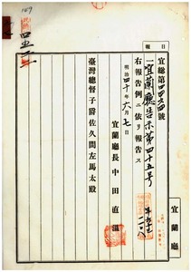 五七 第四五号 宜蘭庁利沢簡堡ノ蘇澳庄・利沢簡庄・頂清水庄・下清水庄・五十二甲庄、羅東堡ノ羅東街、二結堡ノ下三結庄、茅仔椙堡ノ中二結庄・松仔脚庄・滕橄社庄・大埔庄・茅仔椙庄、紅水溝堡ノ鹿埔庄・順安庄・員山庄・大和庄、民壮囲堡ノ謙后庄・壮二庄ニ豚虎列刺発生ノ件