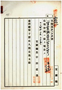 六六 第五四号 宜蘭庁管内ノ呉国風・林茂堂・陳最・楊烏仙・李蔡氏麺・韓謝裾・陳火石・張矮・游万・王長海ハ阿片烟膏購買吸食特許鑑札ヲ、及ヒ陳旺・陳最・張矮・游万・王長海ハ阿片烟膏購買通帳ヲ亡失ニ付キ該鑑札及ヒ該通帳ヲ無効トス