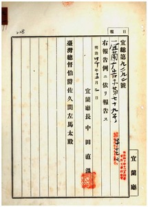 九一 第七九号 宜蘭庁管内羅東堡羅東街ノ藍新・胡錫春、紅水溝堡鹿埔庄ノ江錦章・江錦華、員山堡珍仔満力庄陳市元、二結堡頂五結庄張俶南、茅仔椙堡松仔脚庄林枝・清水溝堡歪仔歪庄郭奠邦、浮洲堡紅柴林庄陳抜英、利沢簡堡利沢簡庄荘茂林、本城堡宜蘭街林維新ヲ宜蘭庁第三公共課嘩準備委員ニ指定ス