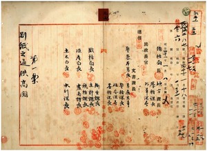 九七 宜蘭庁・桃園庁・新竹庁・台中庁・斗六庁・塩水港庁・蕃薯椙庁・鳳山庁・恒春庁・澎湖庁ノ告示、桃園庁・蕃薯椙庁ノ訓令供閲ノ件(1908-01-08~1908-01-31);九七 第八五号 台北庁管内ニ於テ疑似牛疫ニ罹リタル牛斃死ノ旨同庁ヨリ通知ノ件 (1907-12-26~1908-01-31)