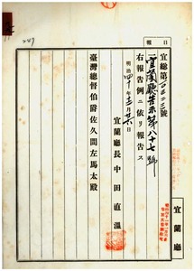 九九 第八七号 宜蘭庁第三公共課嘩組合ハ台湾公共課嘩規則施行規則第七条ニ依リ宜蘭庁長ノ管理トスル件