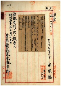 苗栗廳告示第七十五號臺北、臺中兩廳下ニ獸疫通知ノ件、苗栗廳告示第七十六號煙草小賣營業鑑札遺失ノ件、苗栗廳告示第七十七號阿片煙膏購買吸食特許鑑札及同通帳亡失ノ件、苗栗廳告示第七十八號桃園廳外三廳ヨリ獸疫ニ關シ通知ノ件、苗栗廳告示第七十九號徵兵檢查施行部隊指定ノ件、苗栗廳告示第八十號四十年度後期地租及官租ハ街庄長ニ取纏メシムル件、苗栗廳告示第八十一號公館公學校四十年度歲入出豫算追加、苗栗廳告示第八十二號臺南廳ヨリ牛疫流行通知ノ件、苗栗廳告示第八十三號臺北廳ヨリ獸疫ニ關シ通知ノ件、苗栗廳告示第八十四號獸疫發生ノ件、苗栗廳告示第八十五號阿片煙膏購買吸食特許鑑札及仝通帳亡失ノ件、苗栗廳告示第八十六號彰化