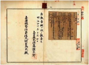 九八 第二六号 明治四〇年四月台中庁訓令第九号庁支庁警察官吏派出所巡査巡査補配置定員中東勢角支庁蕃界警備巡査定員改正ノ件(1907-10-04~日付エラー);第一三三号 彰化庁馬芝堡鹿港街呉烟林氏却ハ旅行地清国ニ於テ外国旅券紛失ノ旨同庁ヨリ通知ノ件(1907-10-04~日付エラー);第二七号 巡査巡査補夏衣日覆着用期限ヲ明治四〇年一一月一五日マテ延期ノ件 (1907-10-30~日付エラー);第二八号 外国旅券下附ニ関スル取扱心得制定ノ件(1907-11-09~1907-12-17);第二九号 明治三七年三月台中庁訓令第九号公医職務規程改正ノ件(1907-11-22~1907-12-17);第三〇号 警察費支弁ニ属スル支庁小使給ハ支庁長ニ対シ月額払切トシ支給額制定ノ件 (1908-01-11~1908-02-19)