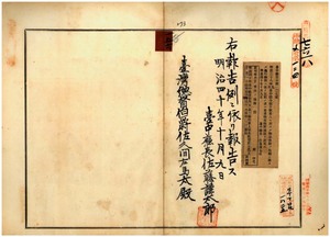 一五六 第一三七号 明治三八年九月台中庁令第一〇号蕃人ニ対スル物品供給ノ取締ニ関スル施行細則ニ依リ、台中庁師東上堡水底椙庄沈阿栄ヘ東勢角支庁所轄内坦伏坪ニ蕃産物交換所開設ヲ許可スルノ件