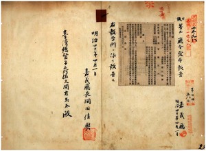 一 第一号 明治三四年一一月嘉義庁令第二号支庁名称位置管轄区域中梅仔坑支庁ヲ廃シ大目根堡竹頭崎庄ニ竹頭崎支庁ヲ設置シ其ノ位置並ニ管轄区域制定ノ件