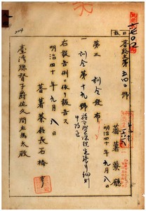 八四 蕃薯椙庁訓令第一九号・二〇号・二一号ノ訓令番号訂正ニ付キ照会及ヒ回答ノ件 (1907-11-15~1907-11-30);第二〇号 明治三九年五月蕃薯椙庁訓令第一四号警察監視区域別表中改正ノ件(1907-10-30~1907-12-19);第二一号 明治四〇年八月蕃薯椙庁訓令第一八号薪炭油費ノ部中追加ノ件(1907-10-30~1907-12-19);第二二号 明治三九年五月蕃薯椙庁訓令第一四号警察監視区域別表中追加ノ件(1907-11-17~1907-12-17);第二三号 明治三九年五月蕃薯椙庁訓令第一四号警察監視区域別表中改正ノ件(1907-12-08~1908-01-23);第二四号 明治四〇年七月蕃薯椙庁訓令第一二号蕃務及脳務ニ従事スル者特別月額旅費支給額別表中追加ノ件(1907-12-20~1908-01-30)