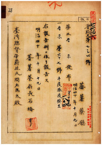 蕃薯廳告示第六十七號臺南廳ニ牛疫發生當廳下ニ豚疫發生ノ件
