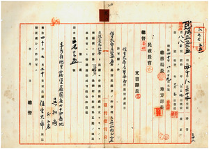 三〇 斗六庁長志賀直順ヨリ副申ノ道路敷地トシテ斗六庁他里霧堡杉園庄ノ保生大帝所属財産ニ付キ管理人ノ呉和尚並ニ信徒総代ノ呉欽賜ト呉年蓬ヨリ同堡他里霧庄ノ聖母廟所属財産ニ付キ管理人ノ張老馬並ニ信徒総代ノ李昌ト陳飛ヨリ出願ノ財産処分ニ付キ許可ノ件(指令第二九三五号)(指令第二九六四号)
