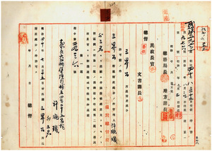 三二 台北庁長佐藤友熊ヨリ副申ノ台北庁大加蚋堡頂内埔庄ノ三界公管理者許謬苗並ニ関係者ノ王乞・許営・敦寛裕ヨリ願出ノ債務ノ整理ト祭祀継続ノ為メニ神明会カ乾隆三六年及ヒ同四〇年ニ買入レタ三界公名義ノ土地ヲ買却セントスル儀ニ付キ許可ノ件(指令第二九三六号)