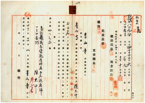 三七 南投庁長能勢靖一ヨリ副申ノ南投庁武東堡施鮎坪庄ノ青山寺ノ敷地ヲ皮仔椙公学校ノ基本財産トシテ寄付スルニ付キ同寺管理人陳大中並ニ氏子総代ノ陳徳音ト陳金栄ヨリ所属財産処分方出願ニ付キ許可ノ件(指令第四〇三五号)