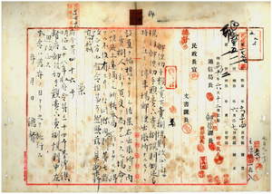 一〇 明治三八年五月府令第三四号台湾総督府郵便切手類売下売捌規則中改正ノ件(府令第四六号)(1907-04-29~1907-06-28);台湾総督府郵便切手類売下売捌規則改正ニ付キ逓信大臣山県伊三郎ヘ報告ノ件(1907-07-02~1907-07-09)