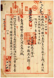 九 大阪商船株式会社取締役社長中橋徳五郎ヨリ同社基隆支店長藤田子儀ヘ明治四〇年度台湾及ヒ南清航路航海命令ニ基ク台湾総督府ヘノ諸請願届書類提出ノ権限委任ノ儀届出ノ件