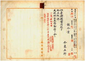 四六 台湾総督府民政部土木局長心得長尾半平ノ内申ニ依リ鳳山庁嘱託今泉五郎ヲ台湾総督府技手ニ任シ台湾総督府民政部土木局勤務ヲ命ス