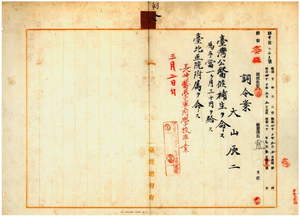 八 台湾総督府民政部警察本署長代理参事官大津麟平ノ具申ニ依リ台湾公医候補生志願ノ長崎医学専門学校卒業生大山辰二ニ台湾公医候補生ヲ命シ台北医院附属ヲ命ス