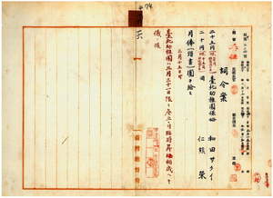 一六 台北幼稚園管理者台湾総督府国語学校長心得持地六三郎ノ内申ニ依リ台北幼稚園廃止ニ付キ台北幼稚園保姆ノ和田サクイ・仁熊栄ヲ職務勉励成績佳良ニ付キ臨時昇級ス