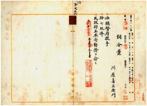 四六 台湾総督府民政部土木局長心得長尾半平ノ内申ニ依リ長年土木局関係ノ調査・工事ニ工夫トシテ勤続シタル川原喜左衛門ヲ死亡ニ付キ遡テ台湾総督府技手ニ任シ民政部土木局勤務ヲ命ス