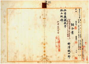 四七 苗栗庁長家永泰吉郎ノ内申ニ依リ元樺太民政署森林調査事務嘱託野沢誠四郎ヲ苗栗庁技手ニ任ス