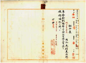 三四 台湾総督府民政部殖産局長宮尾舜治ノ内申ニ依リ局嘱託木村東次郎ニ事務格別勉励ニ付キ一時金ヲ賞与シ辞職願ニ依リ嘱託ヲ解ク