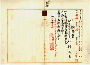 七一 台中監獄長典獄武川銓之助ノ内申ニ依リ台中監獄看守部長石村元吉ヲ台湾総督府監獄監吏ニ任シ台中監獄勤務ヲ命ス
