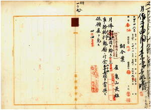 一〇八 台湾総督府民政部警察本署長代理大津麟平ノ内申ニ依リ警察本署勤務台湾総督府雇亀山長雄ニ増俸(三月三一日付)ノ上事務格別勉励ニ付キ一時金(四月二日付)ヲ賞与シ病気ノ為メ当分全治ノ見込ナキニ付キ雇ヲ免ス
