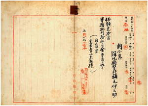 四四 深坑庁景尾支庁勤務深坑庁警部福元伊之助ノ辞職願ニ依リ本官ヲ免シ事務格別勉励ニ付キ一時金ヲ賞与ス
