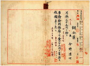 四七 台湾総督府民政部総務局雇今野清次ノ辞職願ニ依リ増俸ノ上(四月三〇日付)、本官ヲ免シ事務格別勉励ニ付キ一時金ヲ賞与ス(五月三日付)