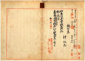 四 塩水港庁長ト台南庁長村上先ノ具申ニ依リ元塩水港公学校教務嘱託沖牧太ヲ台湾小学校教諭ニ任シ台南尋常高等小学校本科正教員ヲ命ス[別紙履歴書なし]