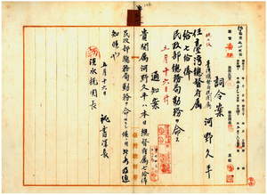 三一 台湾総督府民政部総務局長大島久満次ノ内申ニ依リ台湾総督府税関属淡水税関大稲花出張所勤務河野久平ヲ台湾総督府属ニ任シ民政部総務局勤務ヲ命ス