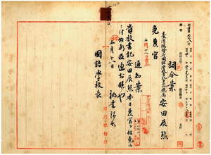 四〇 台北庁長佐藤友熊ノ内申ニ依リ台湾総督府国語学校書記兼台北庁属安田辰熊ノ事務上ノ都合ニ依リ兼官ヲ免ス