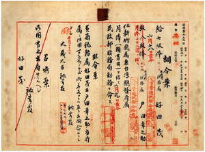 一五 台湾総督府民政部財務局長代理峡謙斉ノ内申ニ依リ大蔵省税務署税務属ノ好田茂(六月一八日付)ト戸田幸之助(六月一九日付)ヲ新竹庁属兼台湾総督府属ニ任シ民政部財務局勤務ヲ命ス