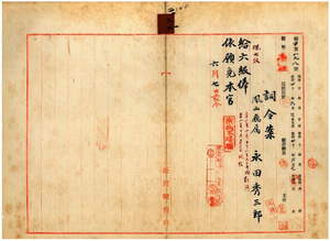 三三 鳳山庁属永田秀三郎ハ麻拉里亜ニ罹リ職ニ堪ヘサル旨ヲ以テ辞職願ニ依リ昇級ノ上本官ヲ免ス