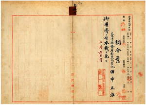 四一 台湾総督府彩票局長宮尾舜治ノ内申ニ依リ台湾総督府彩票局書記田中正雄ニ御用済ニ付キ本職ヲ免ス