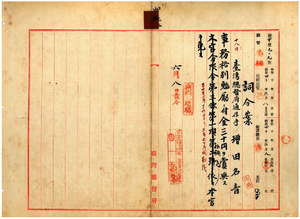 二 台湾総督府通信手増田名音ハ脚気ニ罹リ職ニ堪ヘサル旨ヲ以テ辞職願ニ依リ事務格別勉励ニ付キ一時金ヲ賞与シ本官ヲ免ス