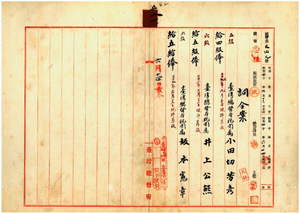 一一 安平税関長岩政憲三ノ内申ニ依リ安平税関勤務台湾総督府税関属小田切芳彦・井上公熊・坂本憲章ヲ昇級ス