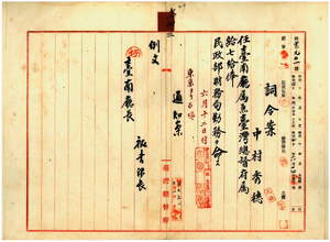 一三 台湾総督府財務局長小林丑三郎ノ内申ニ依リ明治大学法学部高等研究科在学中ノ中村秀穂ヲ台南庁属兼台湾総督府属ニ任シ民政部財務局勤務ヲ命ス