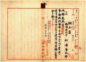 一三 桃園庁技手松浦角太郎ハ疾病ニ罹リ職ニ堪ヘサル旨ヲ以テ辞職願ニ依リ本官ヲ免シ事務格別勉励ニ付キ一時金ヲ賞与ス