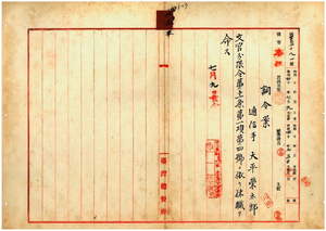 二三 基隆郵便局長早瀬已熊ノ内申ニ依リ基隆郵便局勤務台湾総督府通信手大平栄太郎ニ文官分限令第一一条第一項第四号ニ依リ休職ヲ命ス