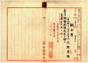 三六 台湾総督府民政部警察本署長大島久満次ノ内申ニ依リ台北庁ペスト予防医務嘱託大野量弥ニ台湾総督府防疫医ヲ命ス
