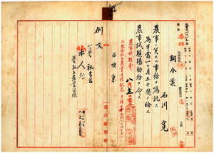 四二 台湾総督府民政部殖産局長宮尾舜治代理小林丑三郎ノ具申ニ依リ熊本県立農業学校教諭石川寛ニ農事ニ関スル事務ヲ嘱託シ農事試験場勤務ヲ命ス