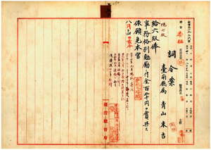 五〇 台南庁属青山末吉ハ疾病ニ罹リ職ニ堪ヘサル旨ヲ以テ辞職願ニ依リ昇級ノ上事務格別勉励ニ付キ一時金ヲ賞与シ本官ヲ免ス