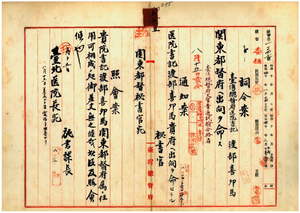 五五 関東都督府秘書官ノ依頼ニ依リ台北医院勤務台湾総督府医院書記渡部喜卯馬ニ関東都督府ヘ出向ヲ命シ(八月一五日付)関東都督府属ニ任セラル(九月七日付)