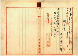 五八 台湾総督府民政部警察本署長大島久満次ノ具申ニ依リ台北庁大加蚋堡台北城内府前街川合診療所勤務赤木栄太郎ニ台湾公医候補生ヲ命ス