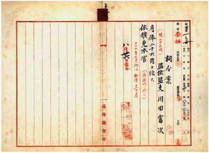 七 台南監獄勤務台湾総督府監獄監吏川田富次ヨリ病気罹患ノ為メ快復ノ見込ナク辞職ヲ願出タルニ依リ平素ノ勤務ヲ評価シ勤続一一ヶ月ニモ拘ハラス特ニ昇級シタル上テ本官ヲ免ス