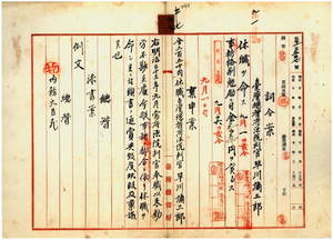三七 覆審法院長石井常英ノ内申ニ依リ私費ヲ以テ海外留学ヲ出願シタル台湾総督府法院判官早川弥三郎ニ休職ヲ命シ事務格別勉励ニ付キ一時金ヲ賞与ス[台北庁長佐藤友熊の関東都督府事務官任用に関する内務秘書官の電報あり]