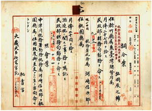 八 台湾総督府民政部財務局長小林丑三郎ノ内申ニ依リ元龍野税務署勤務税務属弘岡辰之輔ヲ新竹庁属兼台湾総督府属ニ任シ民政部財務局勤務ヲ命シ(九月一二日付)、中津川税務所勤務税務属河崎信次郎ヲ桃園庁属ニ任シ酒造税ニ関スル事務ヲ嘱託シ民政部財務局勤務ヲ命ス(一〇月四日付)