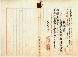 三三 基隆尋常高等小学校罵仔椙分教室勤務台湾小学校教諭瀬川政治郎ハ疾病ニ罹リ職ニ堪ヘサル旨ヲ以テ辞職願ニ依リ本官ヲ免シ事務格別勉励ニ付キ一時金ヲ賞与ス
