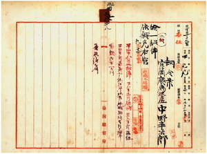 三八 宜蘭庁長中田直温ノ内申ニ依リ宜蘭庁属中野半次郎ハ脚気ニ罹リ職ニ堪ヘサル旨ヲ以テ辞職願ニ依リ昇級ノ上本官ヲ免ス
