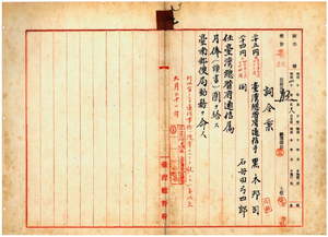 二 台南郵便局長速水経憲ノ上申ニ依リ台湾総督府通信手ノ黒木邦司ト石母田弓四郎ヲ台湾総督府通信属ニ任シ台南郵便局勤務ヲ命ス